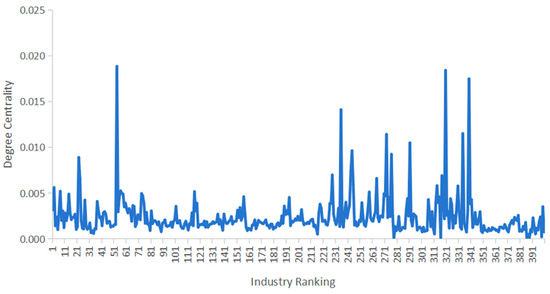 In this figure, nodes represent industries, with industry serial numbers corresponding to NAICS codes and industry names (refer to the industry code reference table in the Appendix A). Edges denote inter-industry linkages. Observation of the U.S. industrial network reveals that no industry exists in isolation; all maintain technological–economic linkages with others. Industries such as Real Estate (Serial No. 320), Management of Companies and Enterprises (Serial No. 339), Petroleum Refineries (Serial No. 235), and Iron and Steel Mills and Ferroalloy Manufacturing (Serial No. 53) exhibit high degrees of connectivity, indicating extensive input–output linkages with other sectors. These industries act as major consumers or suppliers within the economic system and serve as intermediary bridges for indirect interactions between different sectors.