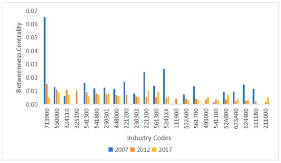 The data employed in this study were obtained from the detailed benchmark commodity-by-commodity total demand input–output (IO) tables provided by the U.S. Bureau of Economic Analysis (BEA). These detailed benchmark data are published every five years, with the most recent data released in 2017. Consequently, this study selects the latest three detailed benchmark IO datasets, corresponding to 2007, 2012, and 2017. Due to the extreme complexity of compiling these detailed benchmark input–output tables and their extended publication intervals, the data may exhibit certain lags. However, owing to the robust characteristics of industrial association networks—where technological–economic linkages and supply–demand relationships between industries demonstrate long-term stability—the real estate sector maintains relatively stable connections with most associated industries over a period [27], such as the enduring technological–economic linkages and supply relationships between real estate and sectors including construction, building material manufacturing, and furniture/appliance manufacturing. Therefore, pre-2017 input–output data can somewhat reflect current U.S. real estate fluctuation diffusion dynamics. When a new detailed benchmark commodity-by-commodity total demand input–output table is published, we will introduce the latest data as a future object of study for this research.