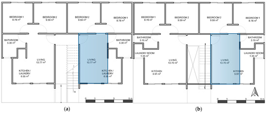 Two units were selected for simulation: Living A (ground floor) and Living B (upper floor), based on high daytime occupancy patterns (Figure 1). The block’s south-facing orientation was preserved. Due to Ecuador’s equatorial location, orientation was not expected to significantly influence thermal performance [30].