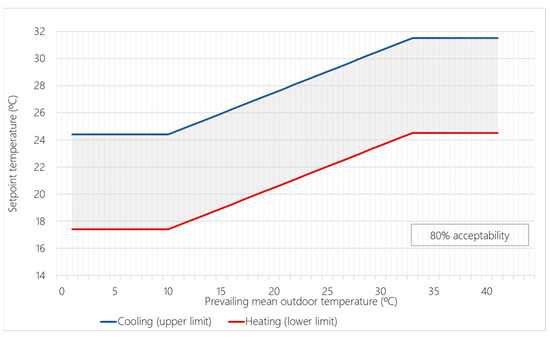 Upper and lower limits considered in the adaptive comfort model with 80% acceptability.