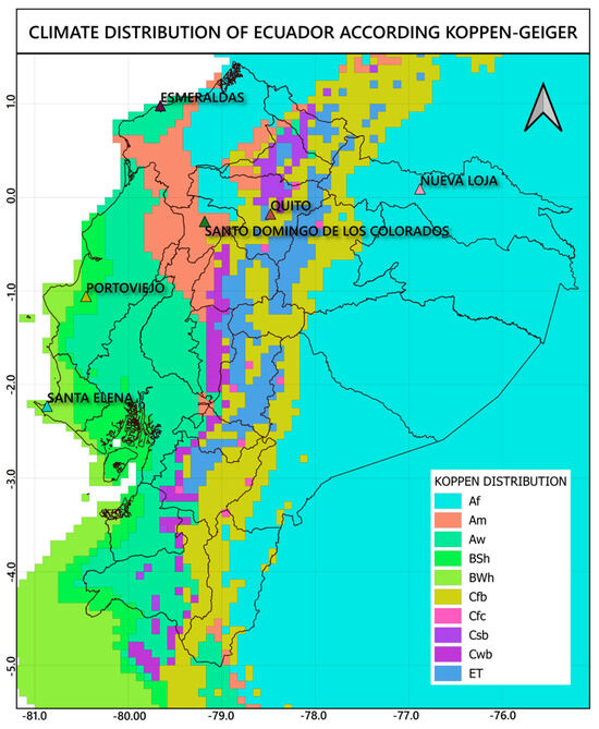 Ecuador’s diverse geography and climate pose distinct challenges for social housing design. The country comprises four major regions—the Coast, Highlands, Amazon, and Galápagos—and spans eight Köppen–Geiger climate zones [28]. Despite this variability, Ecuador experiences only two primary seasons—dry and rainy—with relatively stable temperatures throughout the year [29,30]. These characteristics make adaptive comfort models particularly suitable for the national context. Administratively, Ecuador is divided into 24 provinces, which are further subdivided into cantons and parishes [31].