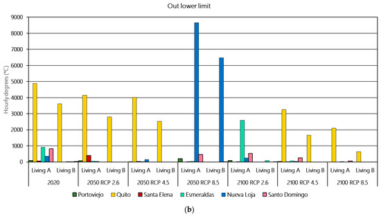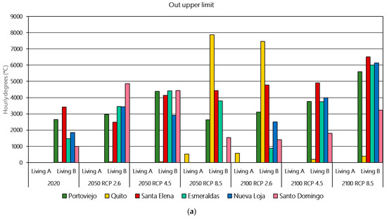 Figure 6 shows the degree-hours outside adaptive limits for each dwelling and scenario. Overall, Living A demonstrates better performance than Living B across most locations and time horizons, particularly in warmer regions. A recurring pattern is the presence of degree-hours below the lower comfort limit in all locations, while upper-limit exceedances are generally more prominent in Living B. Notably, only Quito recorded cooling demand in Living A, while Living B presented upper-limit exceedances in all scenarios and cities.