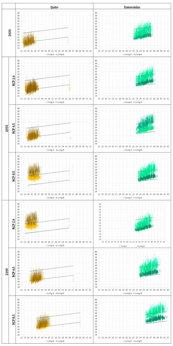 Comparison of the performance of dwellings in Santa Elena (a) and Santo Domingo (b) in the current climate situation and in the projections to 2050 and 2100 in RCP 2.6, RCP 4.5, and RCP 8.5. Axis X shows the predominant average temperature of the outdoor air (°C), and axis Y shows the indoor operative temperature (°C).