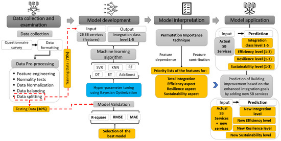 The methodology of the presented study consists of several key components, including a theoretical framework, data collection and preparation, model development, and optimisation. This article continues the authors’ previous research for the development of the Evaluation Framework for Smart Building Integration into Smart City [10,31] and employs a comprehensive supervised machine learning approach to analyse and identify the most essential features and predict the integration level of smart buildings into smart cities.