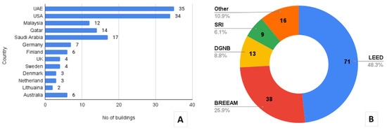 The survey includes data from 13 diverse countries, as displayed in part A of Figure 2, with a higher concentration of smart buildings in the United Arab Emirates (35 buildings) and the United States of America (34 buildings). Other notable countries include Saudi Arabia (17), Qatar (14), and Malaysia (12). The rating systems used in these buildings are shown in part B of Figure 2, where the most common certification is LEED (48.3%), covering 71 buildings and representing the predominant rating system, reflecting its global recognition, followed by BREEAM (25.9%), accounting for 38 buildings. Other certification systems include DGNB (8.8%, 13 buildings), SRI (6.1%, 9 buildings), and others (10.9%, 16 buildings), which may include various regional or proprietary rating systems. The areas of these buildings range from 3000 to 65,000 m2, with the total number of floors between 3 and 44. Furthermore, the majority of the buildings were constructed between 2011 and 2018, and very few were built between 2019 and 2022.