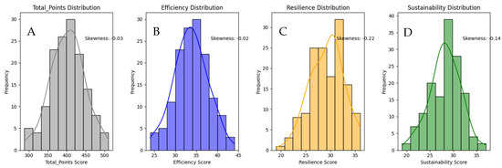 Distribution and normality assessment of smart building integration metrics. (A–D) represent histograms with fitted normal distribution curves for the following scores: Total Points Score, Efficiency Score, Resilience Score and Sustainability Score respectively.