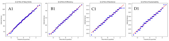 The tested normality distribution of the dataset is presented in Figure 3. The comprehensive analysis of the building scores distribution across buildings reveals crucial insights into the integration levels of smart buildings within smart cities, where the minimum and maximum scores were observed (288–512), respectively. The histogram demonstrates a nearly symmetrical bell-shaped distribution with a slight skewness of −0.03, with most buildings scoring between 380 and 440 and peaking around 410 (Figure 3A). This indicates that the data are central around this range, with a moderate spread and no apparent extreme outliers, and this finding is complemented by the Q-Q plot’s visual assessment of how closely the data points align with the diagonal line representing the theoretical quantiles of normal distribution (Figure 3(A1)). However, minor deviations are observed at the extreme tails, which are not substantial enough to suggest heavy-tailed behaviour of significant non-normality. Further, statistical validation through the Shapiro–Wilk test corroborates these observations (p-value = 0.91) and refers to rejecting the null hypothesis of normality at common significance levels (p-value ≥ 0.05). This statistical evidence, combined with the visual alignment in the Q-Q plot and the bell-shaped histogram, confirms that the data are approximately normally distributed.