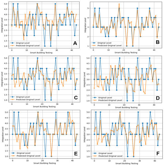 Comparison of predicted vs. actual smart building integration levels across ML models, where (A–F) represent the models KNN, SVR, RF, AdaBoost, DT, and ET, respectively.