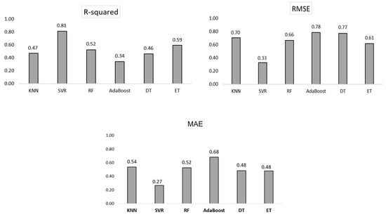 After finishing repeated tuning to its respective best parameters, each model was evaluated based on the R-squared (R2), Root Mean Square Error (RMSE), and Mean Absolute Error (MAE) to identify the best model for each ML algorithm. R-squared, RMSE, and MAE [88,89] are widely recognised for monitoring model selection and reflect different aspects of predictive performance and the purposes of this study. R-squared, as a measure of variance explained, in turn, favours models such as SVR, RF, and ET, which are successful in capturing complex, non-linear relationships, matching well with the goal to identify models that generalise well across a variety of building integration contexts. The RMSE gives more emphasis to a larger error and can identify a model that is more sensitive to the extreme failure of prediction and, therefore, gives more power to models like AdaBoost and RF, which include variance reduction a bit more easily when the large deviation cannot be operated on. On the contrary, MAE, treating all errors equally, allows us to pick models such as KNN and DT, which provide stable, interpretable predictions in the presence of noisy or skewed data. Overall, these measures jointly prevent model selection driven by a single criterion, and hence accuracy, robustness, and applicability to real-world data are traded off.