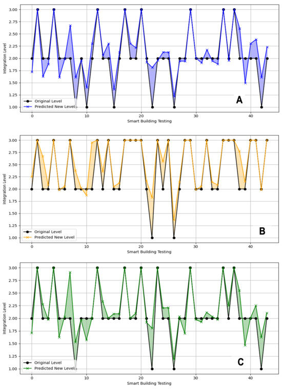 In the formulas as shown in Equations (1)–(3), respectively, given that Yt is the target (actual) value of the integration level from the dataset, Yp is the predicted value of the integration level by the machine learning model, n refers to the total number of data points (smart buildings) in the dataset during the testing, while i represents the specific number of each data point, which helps to identify which specific prediction (Yp) and actual value (Yt) pair are being used within summation.