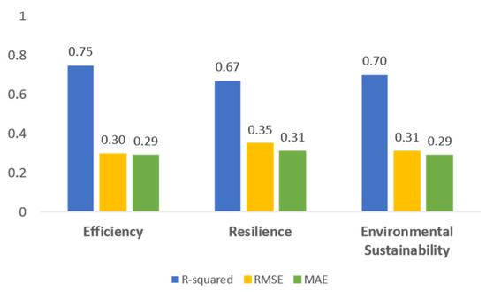 The histograms in Figure 3B–D and Q-Q plots in Figure 3(B1–D1) indicate that all variables exhibit approximately normal distributions, with slight left skewness in resilience (skewness = −0.22) and environmental sustainability (skewness = −0.14). Shapiro–Wilk test results confirm the normality assumption for efficiency (p = 0.534), resilience (p = 0.076), and environmental sustainability (p = 0.173). Further, the Q-Q plots assess the normality by comparing the distribution of observation data (points) against a theoretical normal distribution (diagonal line), which confirms the dataset’s suitability for ML modelling, ensuring robust predictions of smart building integration levels that leverage features such as efficiency, resilience, and environmental sustainability.