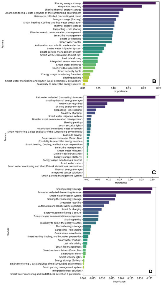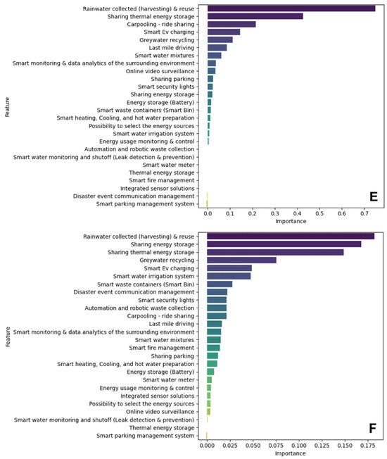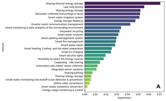 The prediction modelling for this research was integrated with the permutation feature importance technique to obtain the importance of smart building services based on their impact on the trained machine learning model’s output parameter prediction. This method offers a robust means of understanding the model’s prediction process at a global level and provides highly compressed insights into the model [90,91]. It involves the identification of the features (smart building factors—SB services) that have the highest impact on the model’s output parameter (smart building integration level) prediction and enables the establishment of the importance and priority of each feature. This is very essential for the decision-making process when the building owners consider the building’s performance improvement to enhance the overall integration level, or specifically, efficiency, resilience, and environmental sustainability levels.