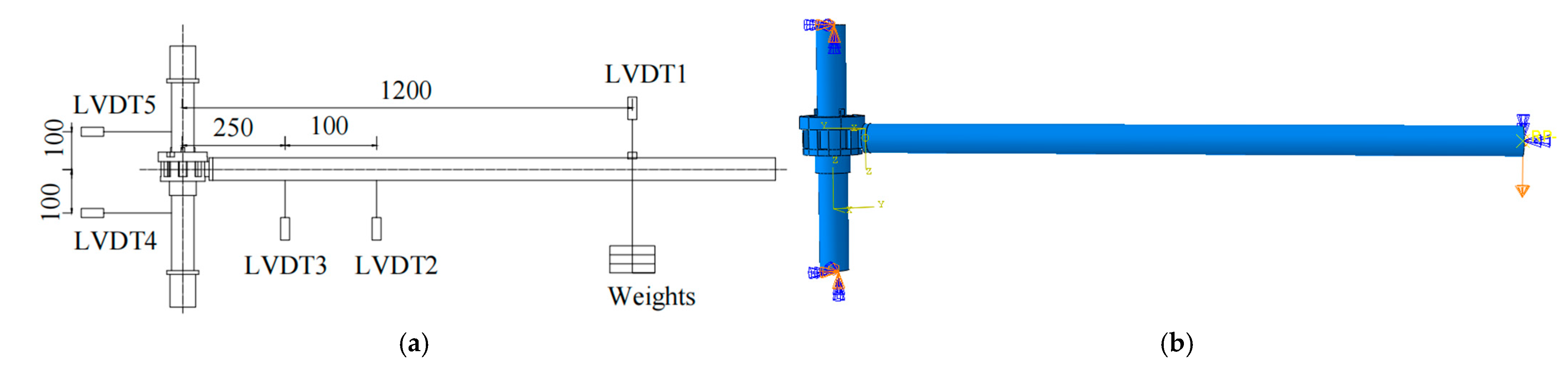 The semi-rigid behavior of scaffold joint has been widely acknowledged in structural engineering practice, with empirical evidence suggesting that conventional idealized assumptions of either hinged or fully rigid connections have been proven inadequate for simulating the load-transfer mechanisms and stability characteristics of scaffold systems [8,9,10,11]. A scaffold joint bending test is conducted on the MTS 322.41 test system, and a verified FE model is established to simulate the novel disc-buckle scaffold joint and accurately analyze its semi-rigid behavior. The constitutive relationship of steel materials based on the Chaboche hybrid strengthening model can achieve a simulation of monotonic loading and low cycle repeated loading [12]. After verifying the correctness of the finite element model of the scaffold joint based on the results of monotonic loading experiments, this paper conducts a simulation study on its low cycle performance to predict the low cycle performance of the scaffold joint. Figure 4a illustrates the bending test configuration for the proposed joint assembly, while Figure 4b presents the corresponding FE model. The upper and lower ends of the vertical pipes in the bending test are fixed and clamped by the upper and lower clamps of the MTS machine. In the finite element model, all degrees of freedom at the upper and lower ends of the pole are constrained to achieve fixed end constraints.