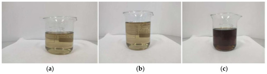Schematic diagrams of the appearance of solutions with different concentrations: (a) 20% magnesium acrylate solution; (b) 25% magnesium acrylate solution; (c) 30% magnesium acrylate solution.