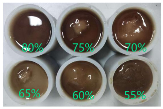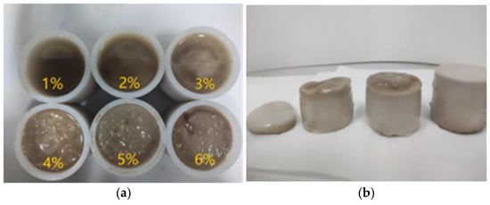 Based on the solidification time, solidification effect, improvement of the polymer’s own properties, and the influence on the volume stability when immersed in soil samples of 25% concentration magnesium acrylate solution under different glycerol concentrations, the glycerol ratio with the best performance after improvement was selected. The final step was to study the influence of adding different contents of sodium methyl silicate solution on the curing performance of the modified magnesium acrylate polymer. First, determine the influence of adding sodium methyl silicate solution with different contents on the curing time. The specific experimental plan is shown in Table 3.