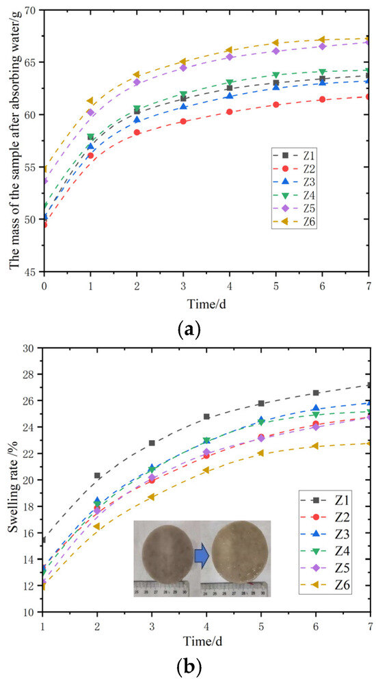 As shown in Figure 3a, the mass changes in magnesium acrylate polymers with six different initiator ratios Z1–Z6, after water absorption within 1–7 days were studied and observed. From the perspective of the curve slope, the curve slope of magnesium acrylate polymer in the first two days is significantly greater than that at other times, indicating that it has a relatively fast speed in the initial stage of water absorption and can absorb a large amount of water. The slopes of the curves of materials Z1, Z3, and Z4 are relatively close, and the water absorption rates are relatively moderate. The curve slope of Z2 material is the smallest, indicating that its water absorption process is slow. As time increases, the slopes of the curves of each material gradually decrease, indicating that the water absorption rate gradually slows down and tends to stabilize. The swelling curve should be able to clearly show the changing trend of the swelling process of the sample over time. At the beginning stage of the curve, the swelling degree increases rapidly over time, which is due to the rapid diffusion of solvent molecules into the interior of the sample. As time goes by, the swelling rate gradually slows down. When the swelling equilibrium is reached, the degree of swelling no longer changes with time.