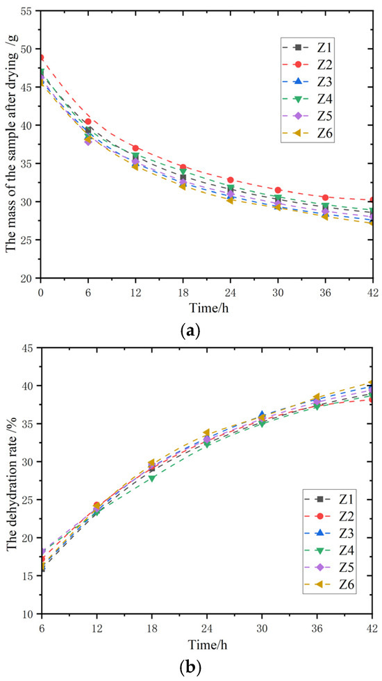 Figure 4a shows the variation of the mass of the samples after drying over time. Within the initial 6 h, the absolute values of the slopes of each curve are relatively large. The mass of the six samples, Z1 to Z6, decreased rapidly in the early stage of drying. During the 6–24 h period in the middle stage, the absolute value of the curve slope gradually decreases, the rate of sample mass decline slows down, the slope differences among different samples narrow, and the drying process enters a relatively stable deceleration stage. After 24 h in the later stage, the slopes of each curve approach 0, indicating that the quality of the sample tends to stabilize after drying and no longer shows obvious changes.