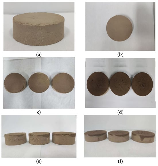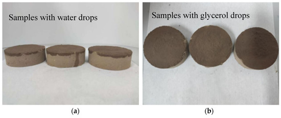 Whether the penetration process of magnesium acrylate solution causes damage to cultural relics, such as site soil, is an important indicator for evaluating the quality of polymers. Therefore, the main purpose of this experiment is to verify whether the magnesium acrylate solution causes expansive damage to the soil structure. Silty clay was used as the preparation soil sample, and the density and porosity were basically kept consistent. Deionized water was used as the control group, and magnesium acrylate solution was used as the experimental group. The experimental operation process is to drop the solution evenly onto the surface of the soil block (5 drops each time, with an interval of 5 min), observe, and record the experimental phenomena. In the experimental group, the magnesium acrylate solution selected a ratio with better swelling and water loss rate performance. The initiator content was 5%, and three parallel samples were set up to reduce random errors. Only deionized water was used as the benchmark for comparative tests to eliminate the interference of the soil’s own characteristics. The result is shown in Figure 5.