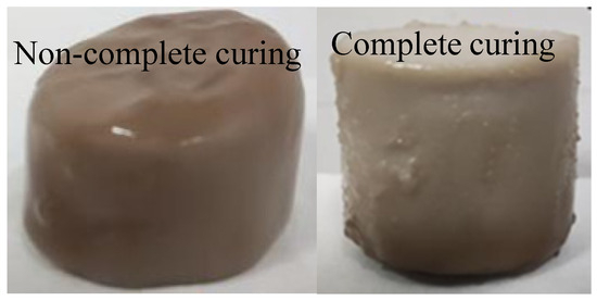 After adding different amounts of glycerol, both the curing time and curing effect of magnesium acrylate polymer changed. The addition of glycerol prolonged the curing time of magnesium acrylate polymer. With the increase in glycerol content, the curing time also increased. The additional amount of glycerol also directly affected the curing of magnesium acrylate polymer. As shown in Figure 6 and Figure 7, when the glycerol content exceeds 55%, the magnesium acrylate polymer undergoes incomplete curing. After 6 h, it basically stops curing, with a layer of transparent liquid on the surface and curing at the bottom. The overall mass of the sample after demolding is relatively small, and it is relatively soft after curing. Based on the analysis of its curing time and effect, in the subsequent experiments, the dosage of glycerol should be controlled below 55% to avoid the negative impact of excessive glycerol incorporation on the curing time and curing effect of the magnesium acrylate polymer.