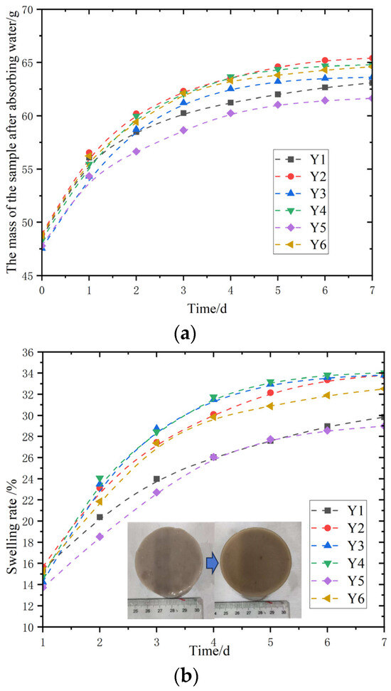 Swelling test of modified polymer. (a) Mass change curve; (b) curves of swelling rate change.