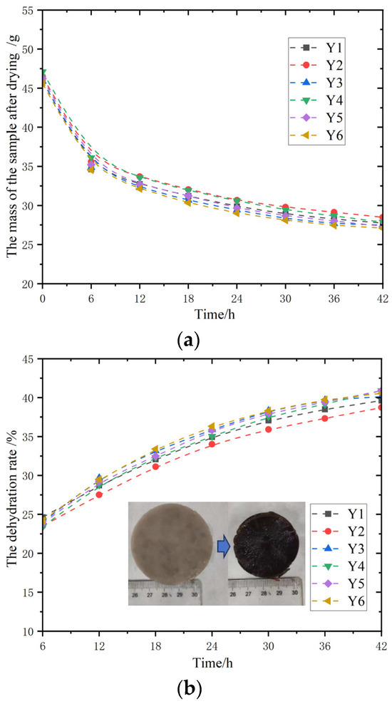 The horizontal axis of Figure 9a represents time (h), and the vertical axis represents the mass of the sample after drying (g). The variation trends of the mass of the six different samples Y1–Y6 after drying with time show that as time increases, the mass of each sample gradually decreases after drying, and the decline is relatively large in the initial stage and tends to be stable in the later stage. Figure 9b shows that the horizontal axis also represents time (h), and the vertical axis represents the dehydration rate. The changes in the dehydration rates of the six samples Y1–Y6, over time. As time goes by, the dehydration rates of each sample gradually increase, and the rate is relatively fast in the early stage and gradually stabilizes in the later stage. The growth trends of the dehydration rates of different samples are slightly different.