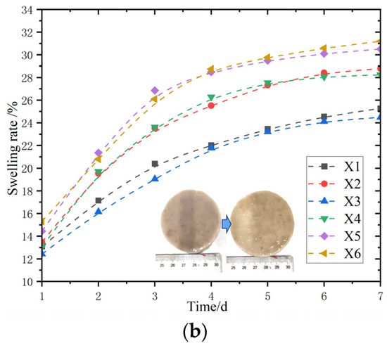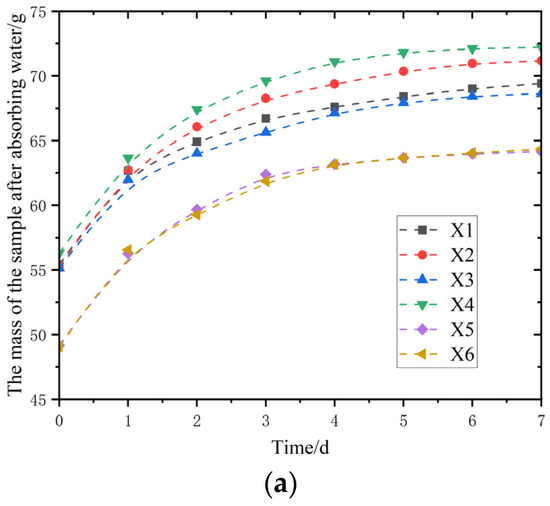 As shown in Figure 11a,b, the mass changes and swelling rate changes in different samples (X1–X6) after water absorption over a period of time are presented, respectively. Figure 11 shows the mass change in the samples after absorbing water. As the time extends from 0 days to 7 days, each sample shows a trend of increasing mass after absorbing water, and the slope represents the water absorption rate of the samples. The slope of the curve is relatively large in the early stage and remains at a high level all the time, indicating that it can absorb water rapidly in the early stage of the experiment and maintain a relatively fast water absorption rate continuously. The material has a strong affinity for water or has a microstructure that is conducive to the rapid entry of water. As time goes by, the slopes of each curve gradually decrease and approach a flat state, indicating that the water absorption process gradually reaches saturation. The slope of the swelling rate change curve in Figure 11 reflects the swelling rate of the sample. By comparing the swelling result change graphs of acrylic polymers and glycerol acrylic polymers, it was found that the incorporation of sodium methyl silicate solution had no effect on the swelling performance of the modified polymer composites.