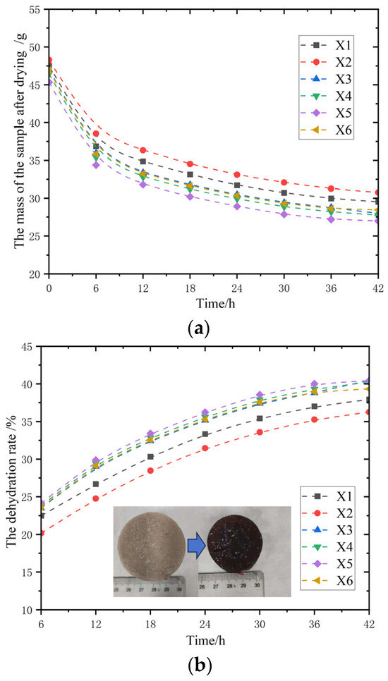 Figure 12a shows the mass–time relationship graph of the samples after drying. Within the initial 6 h, the absolute values of the slopes of each curve are relatively large, indicating that in the initial stage of drying, the mass of all samples decreases at a relatively fast rate, and during the initial stage of drying, moisture rapidly detaches from the samples. During the intermediate stage of 6–24 h, the absolute values of the slopes of each curve decreased, indicating that the rate of decline in the sample mass slowed down. For example, in the X1 curve, the slope changes significantly, indicating that the rate at which moisture detaches from the sample slows down at this time, and the sample gradually enters a slow drying process. After 24 h in the later stage, the slopes of each curve tend to level off and approach 0, indicating that the sample quality tends to stabilize, the moisture content basically no longer changes, and the drying process is approaching the end.
