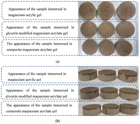 After the above multiple sets of experimental tests, it was finally explored whether the addition of sodium methyl silicate solution would change the original properties. It is known that the addition of sodium methyl silicate solution did not cause any change in the properties of the modified magnesium acrylate polymer. Therefore, the soil sample immersion test was conducted on the composite magnesium acrylate polymer with a glycerol content of 40% and a sodium methyl silicate solution content of 2%. The experimental operation procedure involves uniformly dropping the composite magnesium acrylate polymer solution onto the surface of the soil block (five drops each time, with an interval of 5 min). The initiator content is 5%. Three parallel samples are set up to reduce random errors. Observe and record the experimental phenomena [31,32].