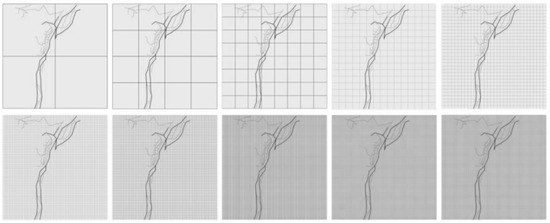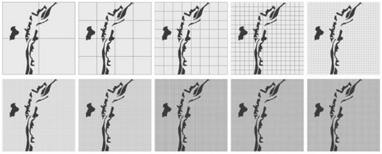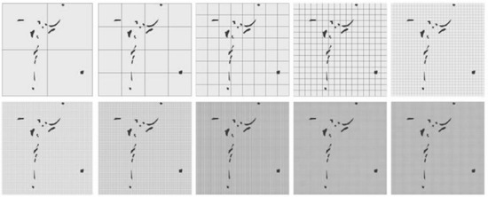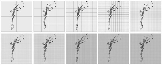 The box-counting method was chosen due to its computational simplicity, suitability for analyzing fractal-like structures in binary images, and widespread application in similar image-based complexity analyses [55,56]. Compared with other fractal dimension estimation methods such as the Hausdorff dimension or the correlation dimension, the box-counting dimension offers a balance between accuracy and implementation efficiency, particularly when dealing with pixel-based digital images [57,58]. The Hausdorff dimension, while mathematically rigorous and widely regarded as the most precise fractal dimension, is often computationally intensive and challenging to approximate in discrete digital contexts [59,60]. Similarly, the correlation dimension requires large datasets and involves complex calculations of point-to-point distances, which may not be feasible or efficient for image data with limited resolution [61,62]. In contrast, the box-counting method simplifies the estimation process by overlaying grids of varying sizes and counting occupied cells, making it highly adaptable to binary images and relatively straightforward to implement algorithmically [63,64]. This method also provides consistent and reproducible results even when applied to noisy or imperfect data, which is common in real-world image analysis scenarios. Therefore, the box-counting dimension serves as a practical and reliable choice for quantifying the fractal characteristics of digital images, balancing theoretical robustness with computational practicality. Let the initial grid size be denoted as . The grid undergoes iterations of bisection, where at each iteration the grid size is halved. After the -th iteration, the grid size is