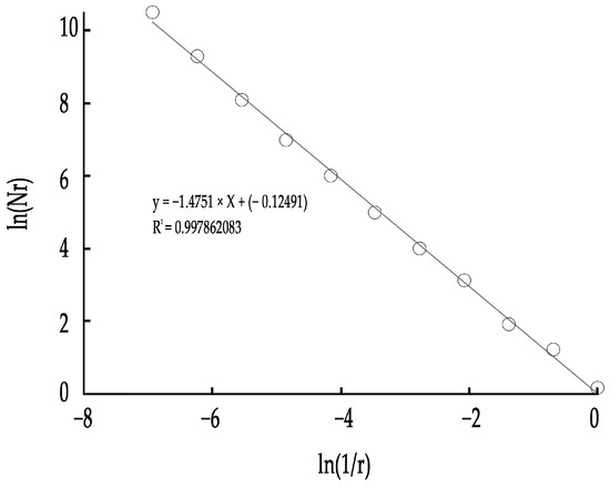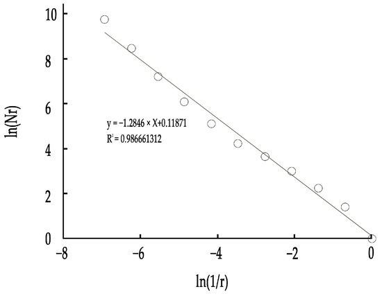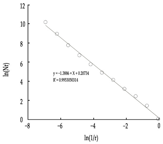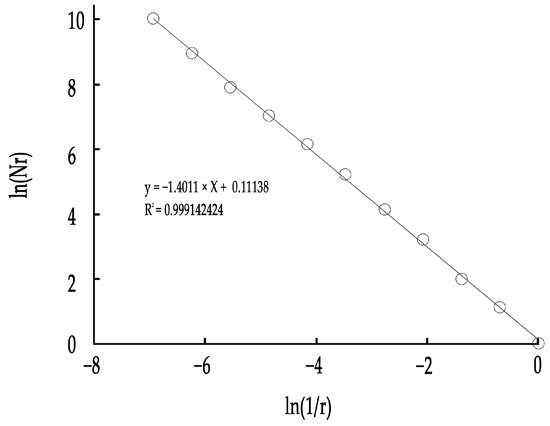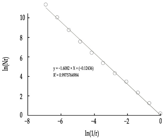 A grid is overlaid onto the residential building contours of Heijing Village, and boxes intersecting with the buildings are recorded as non-empty. At each iteration, the grid size is halved, and the number of non-empty boxes is counted at that scale. This iterative procedure continues across multiple scales, ranging from 2 to 1024 units. The resulting data provide a detailed quantitative description of the spatial distribution of residential buildings, offering insights into the structural complexity and spatial organization of the village. By analyzing the changes in the count of non-empty boxes across scales, it is possible to identify self-similar patterns inherent in the village’s spatial configuration, which may contribute to informing future preservation and planning strategies [67]. This fractal approach is particularly useful for assessing the resilience of traditional villages to modern urban pressures and guiding sustainable rural development.