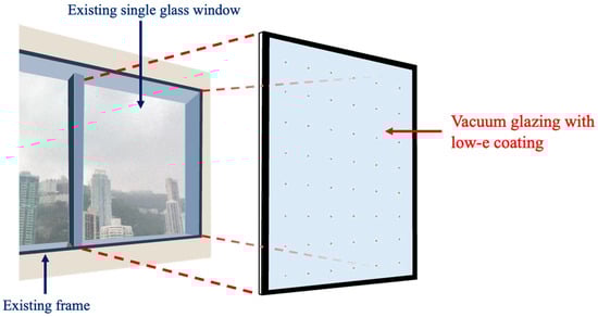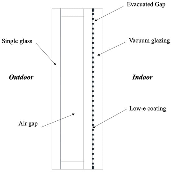 To upgrade inefficient windows without major building renovations, this study employs a secondary glazing approach for the VIG retrofit applications. As illustrated in Figure 1, the VIG systems with low-e coating were manufactured to a size that can precisely fit into the existing window frames. The retrofitting work, which was conducted by South Star Glass Limited, installed the VIG onto the interior side of the existing single glass window. The VIG products were provided by Luoyang LandGlass Technology Co., Ltd. (Luoyang, China). The VIG was attached to the existing window glass with warm edge spaces as a secondary glazing. Figure 2 shows the structure of the VIG retrofitted window as a triple glazing unit with an external air gap and an internal vacuum gap. By deploying this fast and cost-effective retrofitting method, the VIG retrofitted window systems can enhance the thermal performance of existing windows while preserving aesthetics and daylight availability.