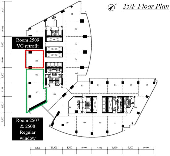 The field tests were conducted in two rooms of a high-rise commercial building in Hong Kong. Figure 3 shows the layouts of the 25/F floor plan, where the numbers from 01 to 11 represent individual office rooms in the west wing and east wing. The two test rooms are located on the west wing of 25/F, i.e., Room 2509 with the VIG retrofit and Room 2507/2508 (a combined room) with the existing windows without retrofit. There is no shading from surrounding buildings on the 25/F of the southwest façade.