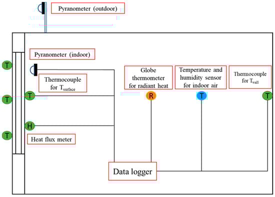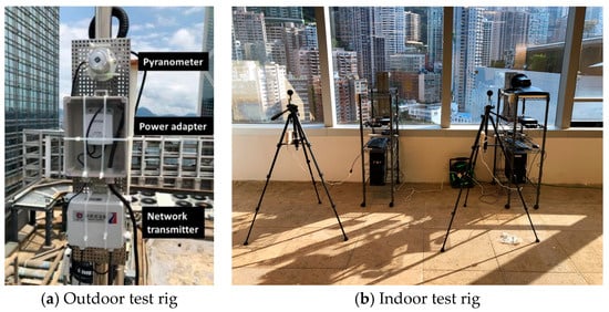 Figure 5 shows the outdoor equipment on the rooftop and the indoor test rigs. One pyranometer was installed on the rooftop with a network transmitter so that the measured data could be uploaded to the online experiment platform simultaneously. For each indoor test rig, one indoor pyranometer, one thermocouple for the inside surface temperature, one globe thermometer, and one temperature and humidity sensor were set up and connected to the data logger GL840. The measured data were monitored and controlled via a PC using their application software. Each PC has WLAN access to the internet. Hence, the remote monitoring of the data acquisition system can be achieved by using a remote control program. To ensure the test reliability and minimize the measurement errors, all sensors were calibrated before the experiments. The temperature sensors were compared to an NIST-traceable thermometer at three known temperature points: 0 °C, 25 °C, and 100 °C. Pyranometers and heat flux sensors were calibrated by the manufacturers. The measurement range, accuracy, and error of the key instruments in the field tests are shown in Table 1.