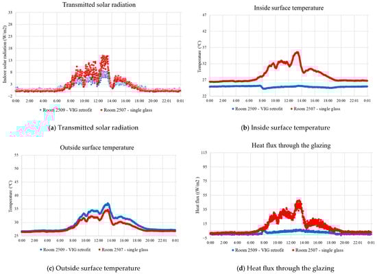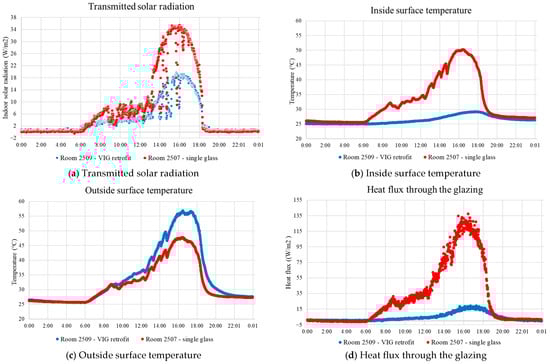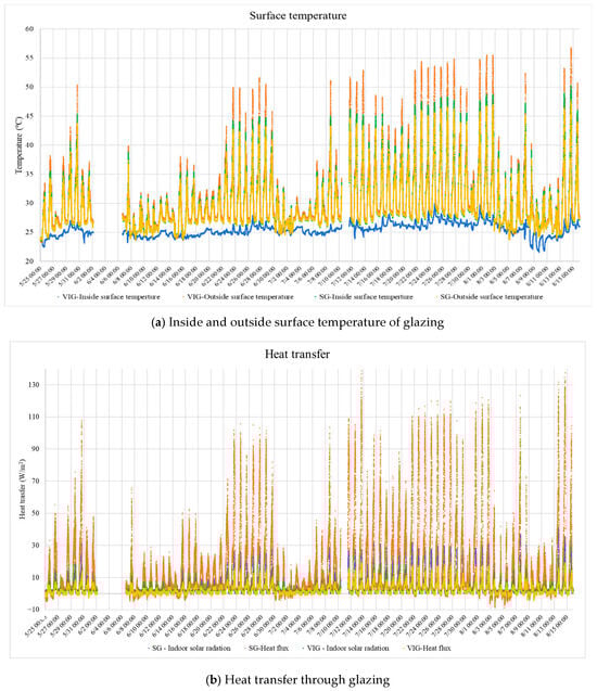 As shown in Figure 9b,c, the thermal responses of the VIG retrofit and the single glass were quite different. For the existing single-pane coated glass, the inside and outside surface temperatures showed a similar trend to the transmitted solar radiation. And the inside surface temperature was slightly higher than the outside surface temperature. The ranges of the inside and outside surface temperatures were 25.5 °C to 50.2 °C and 25.6 °C to 47.8 °C, respectively. The grey coating on the inner surface of the existing glazing absorbs a certain amount of solar radiation, which is then transferred to both indoor and outdoor spaces through convective heat transfer and long-wave radiation. Therefore, the heat flux through the single-pane coated glass was highly responsive to the incident solar radiation.