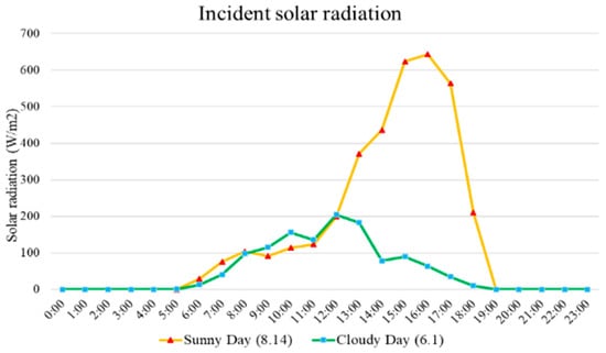 The measured incident solar radiation on a typical sunny day and a typical cloudy day.