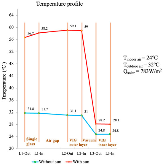 The energy performance of the VIG retrofit application highly depends on the thermal response of the vacuum glazing. To investigate the heat transfer behavior of the VIG under the standard test conditions, the Berkeley Lab WINDOW was used to calculate the temperature profile of the VIG retrofit application layer by layer, as shown in Figure 11. The simulations of different scenarios were conducted under the NFRC 100-2014 summer conditions, where the outdoor design air temperature is 32 °C, the indoor design air temperature is 24 °C for air-conditioning space, and the solar radiation is 783 W/m2.