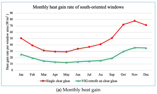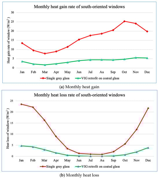 Comparisons between the monthly heat gain/loss rates of the VIG retrofit application and single-coated glass.