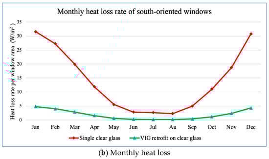 The monthly heat loss rates of the VIG retrofit application and the single clear glass in Hong Kong are presented in Figure 12b. Since Hong Kong is in a cooling load-dominated region, due to the excellent thermal insulation performance of the vacuum glazing, the heat loss through windows in winter is reduced dramatically compared with a single clear glass. The reduction in the heat loss is 85.0% in January to 94.2% in August. The average reduction ratio of the total heat loss is 89.0%. The heat loss in summer may happen at nighttime sometimes when no air-conditioning is provided.