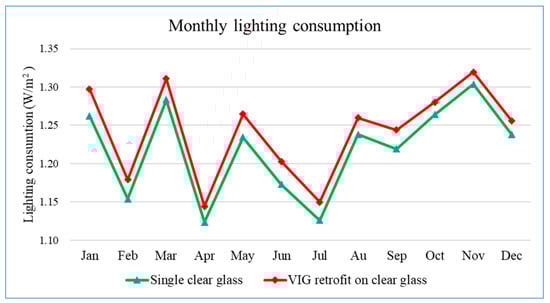 Comparisons between the monthly lighting consumption of VIG retrofit application and single clear glass.