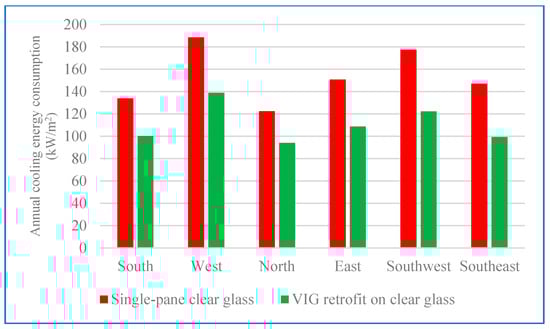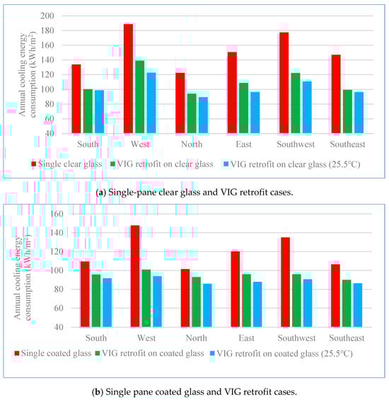 The annual cooling energy consumption for different scenarios: (a) single-pane clear glass and VIG retrofit on clear glass; (b) single pane coated glass and VIG retrofit on coated glass.