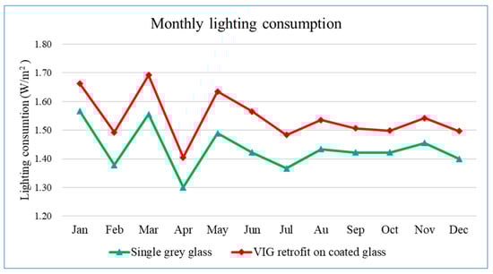 Comparisons between the monthly lighting consumption of VIG retrofit application and single-coated glass.
