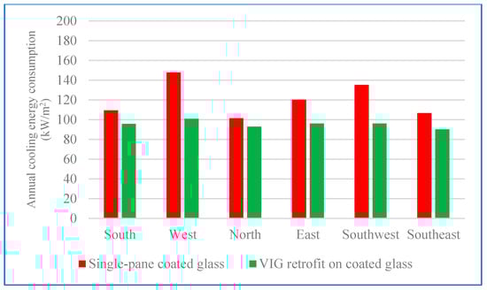 Based on the previous results, the additional energy-saving potential of the VIG retrofit due to the reset cooling point can be determined. Figure 22 shows the annual cooling consumption under different scenarios. For the VIG retrofit on clear glass, as presented in Figure 22a, the energy-saving potential is higher for the reset cooling setpoints, which are 26.1%, 32.0%, and 35.0% when facing south, west, and east, respectively. For the VIG retrofit on coated glass (Figure 22b), the average energy saving ratio also increases from 8.4–31.7% (setpoint: 24.5 °C) to 12.1–36.4% (setpoint: 25.5 °C). The average energy-saving potential is 45.2 kWh/m2 for the VIG retrofit on clear glass and 29.2 kWh/m2 (floor area) for the VIG retrofit on coated glass.