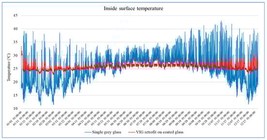 The previous results show that the VIG retrofit applications can effectively reduce the heat gain and heat loss. Figure 18 shows the inside surface temperature of the VIG retrofit on the single-coated glass (Case 2). Although the outdoor temperature fluctuates with different conditions, the inside surface temperature of the VIG retrofit is much more stable than that of the single-coated glass. The average inside surface temperature is around 25 °C. The standard deviation for the VIG retrofit application is 1.16, which is much lower than the standard deviation of the single-coated glass at 5.55. The results indicate that the VIG retrofit applications can stabilize the inner glass surface temperature. In terms of occupant preference in subtropical climates, it was found that a cooler indoor temperature is preferable [43]. The occupant behaviors were affected by their thermal sensation and the indoor operative temperature, such as the tendency to drink a cold beverage and wear more or thicker clothes [44]. Therefore, occupants may be more sensitive to dramatic temperature variations. The low-e coating of the vacuum glazing could control solar heat gain so that the radiant temperature of the room can also be decreased. Therefore, the indoor thermal comfort was expected to be improved when the VIG retrofit was applied.
