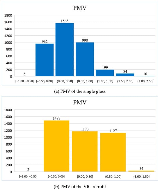 Figure 19 shows the annual distribution of the PMV for the VIG retrofit application and the single clear glass during occupancy time. It can be found that, compared with the single glass, the number of PMV of the VIG retrofit within ±0.5 and ±1 increased by 5.3% and 7.3%, respectively. Therefore, the thermal comfort can be improved by the VIG retrofit. It is worth noting that the cases of PMV > 1 are primarily prevented by the application of VIG retrofit, which indicates that the VIG retrofit can reduce the overheating situation.