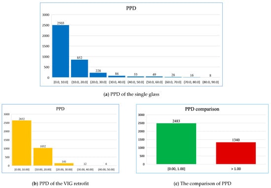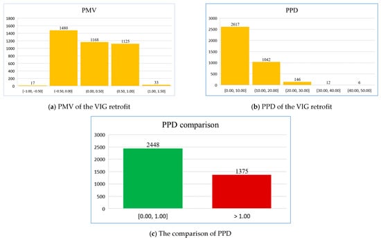 As shown in Figure 20a,b, for the VIG retrofit application, the PPD under 10 occurs for 2632 h, and the PPD under 20 for 3664 h, which is 5.2% and 9.2% higher than that of the baseline, respectively. It is also found that the cases of PPD > 30 rarely occur when the VIG retrofit is applied. Therefore, it can be concluded that the VIG retrofit application can effectively reduce the number of thermally dissatisfied people. As shown in Figure 20c, compared the PPD of the two types of windows at each time step, for most of the time, the prediction of thermal dissatisfaction of the VIG retrofit application is lower than that of the single clear glass. Therefore, the VIG retrofit can also significantly improve the thermal satisfaction of occupants.