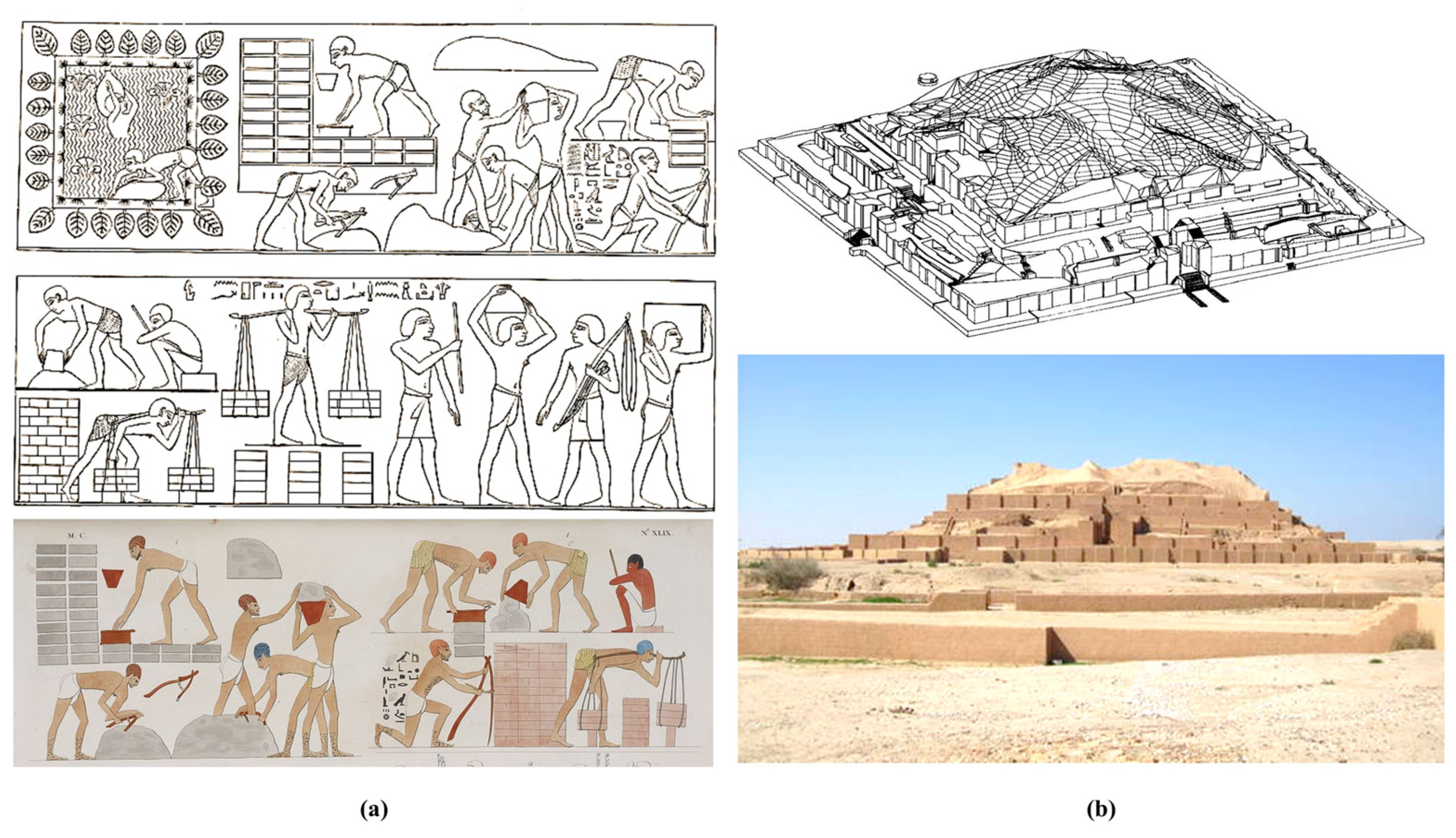 Adobe and ceramic bricks are man-made materials that were documented in the mural paintings of Rekhmire, vizier of Egypt at around 1450 B.C., in Thebes (Figure 1a) [1]. Gaius Plinius Secundus (23/24–79 AD) [2], known as Pliny the Elder, describes the manufacturing process, dimensions, and uses of these materials in Naturalis Historia (72–79 AD), Book XXXV, Section 49. It has been used and recognized as part of world heritage, as in the case of the ruins of the sacred city of the Kingdom of Elam, which are enclosed by three massive concentric walls and located at Tchogha Zanbil. The city was founded around 1250 B.C. (Figure 1b) [3].