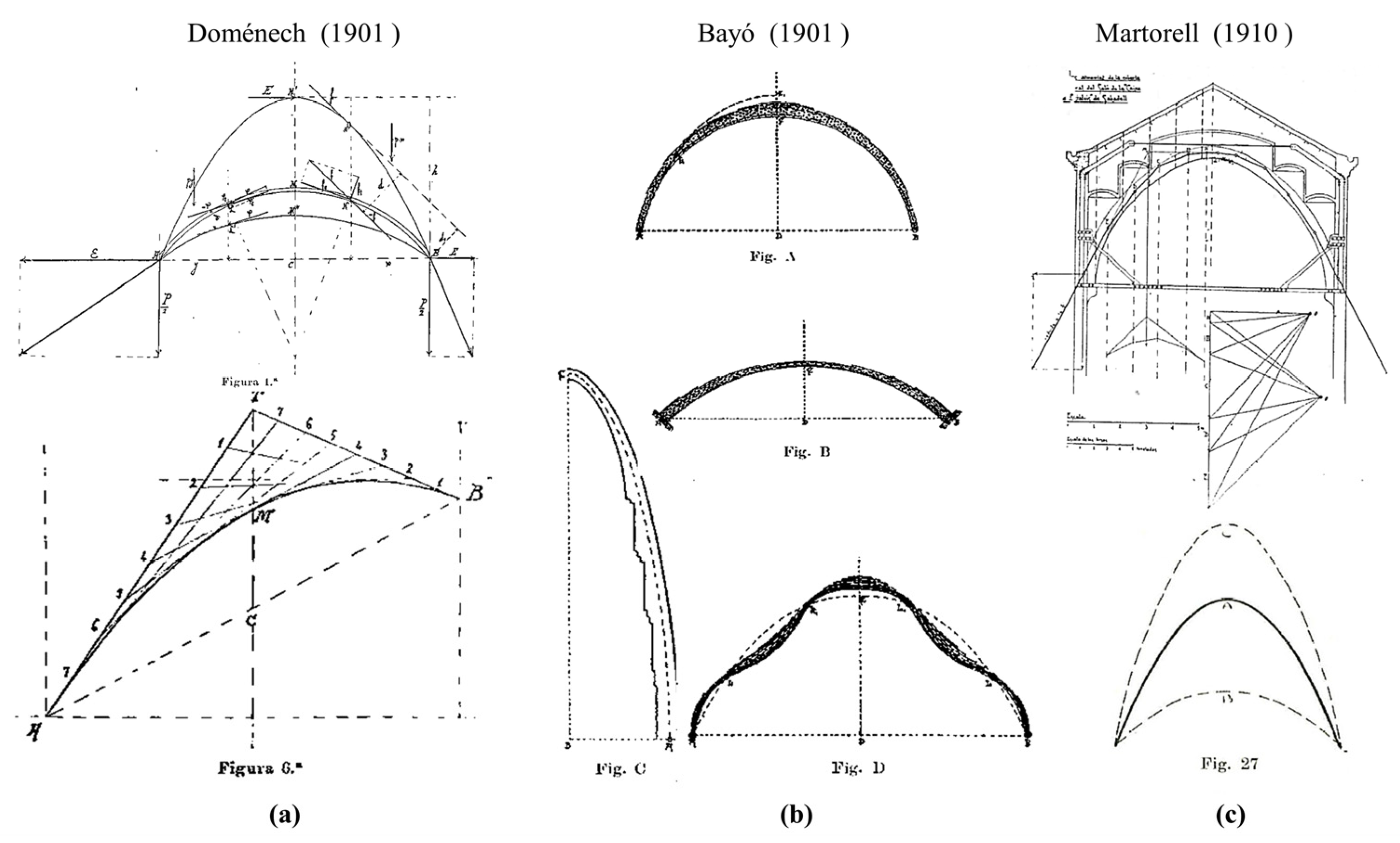 Figure 12. Mechanics of thin-tile vaulting in Catalonia at the beginning of the 20th century. (a) José Doménech y Estapá (1901) [69]; (b). Jaime Bayó Font (1901) [70]; (c). Jeroni Martorell i Terrats (1910) [71].