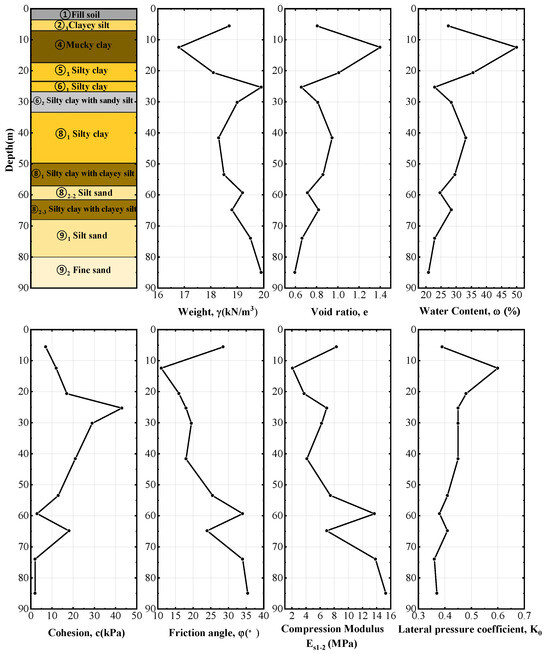 This site is located in the Yangtze River Estuary area. The underground soil structure here shows specific distribution characteristics, mainly consisting of soft clay layers. Beneath the soft clay layers, there is a certain range of sandy soil layers. Except for the surface miscellaneous fill soil, the distribution of soil layers within a depth of 90 m underground in this area and their main basic physical parameters and mechanical parameters are detailed in Figure 1. As can be seen from the figure, within the 0–50 m excavation range, the physical and mechanical properties of the strata are heterogeneous, among which the physical and mechanical properties of the mucky clay layer are significantly different from those of other strata; the 50–90 m range is mainly dominated by sandy soil, with relatively small variations in its physical and mechanical properties.