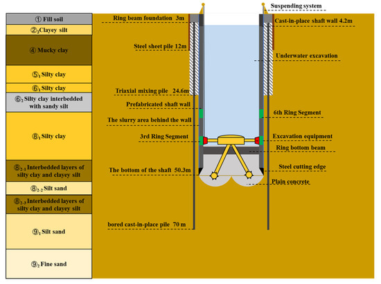 The development of vertical shafts in engineering construction is a history of continuous breakthroughs and innovations. Initially, vertical shafts adopted cast-in-place shaft wall structures. Traditional mechanical equipment such as excavators were used for excavation and slag removal, and the shafts sank by relying on their own weight to overcome the friction with the soil layer [3]. However, this method has low construction efficiency, poor stability, and is prone to sudden sinking or the stoppage of sinking. It also has a significant impact on the surrounding environment. With the evolution of technology, new methods such as the space system (SS) [4] caisson method, the press-in caisson method [5], and the super open caisson system (SOCS) method [6] have emerged. In the SS method [4], the outer contour of the cutting edge extends approximately 15–20 cm beyond the boundary of the shaft wall, creating a gap between the outer wall of the shaft and the soil. Gravel is filled in the gap to reduce frictional resistance while ensuring the stability of the ground. The press-in caisson method [5] uses a ground anchor reaction device and a through-hole jack at the top of the shaft on the ground to apply downward pressure, solving the problem of difficult sinking and enabling the adjustment of the shaft’s attitude. It is suitable for projects with strict environmental requirements. Based on the press-in method, the SOCS method [7] uses an underwater excavator on the inner wall of the shaft to dig the soil and discharge the sludge, reducing the sinking resistance, and then presses the shaft into the ground with the ground anchor reaction device. It is suitable for urban construction projects. The vertical shaft sinking machine [8,9,10,11] developed by Herrenknecht AG in Germany is more advanced. It uses underwater excavation to improve excavation efficiency. The VSM method reduces resistance through over-excavation and filling with bentonite slurry. The movement is controlled by a lowering unit to avoid sudden sinking. It also integrates the shield tunnel lining technology and can precisely and actively control the sinking process. It has many advantages such as deep excavation, little disturbance, and high speed, and is widely used in practical projects with good results [12,13,14]. Some projects with shaft construction using the VSM method are shown in Table 1. However, it should be noted that there are still many difficulties and limitations in the shaft sinking by the VSM method. For example, due to the prefabricated structure of the shaft wall, the shape of the shaft is mostly limited to a circular shape. Also, the shaft is excavated blindly underwater during the sinking process, and encountering obstacles such as gravel during the excavation may damage equipment and cause construction delays. In addition, the underwater concrete pouring after the excavation is completed also poses great challenges to on-site construction.