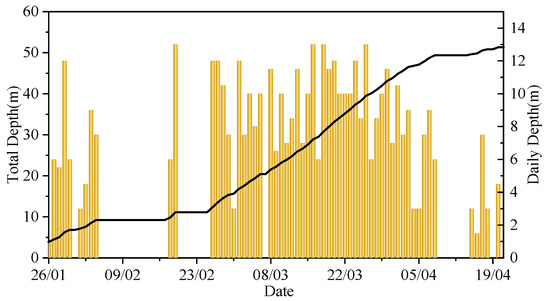 In this case, the shaft excavation started on 26 January 2024, and the pumping was completed on 23 May. The excavation and sinking stage occurred from 26 January to 21 April. The excavation speed during the tunneling stage is shown in Figure 4. The subsequent concrete pouring and pumping stage occurred from 21 April to 23 May. For convenience, in this paper, the shaft excavation and sinking stage is defined as stage 1, and the subsequent slurry replacement, bottom concrete pouring, and pumping inside the shaft are defined as stage 2. The construction processes of the shaft excavation are summarized in Table 2.